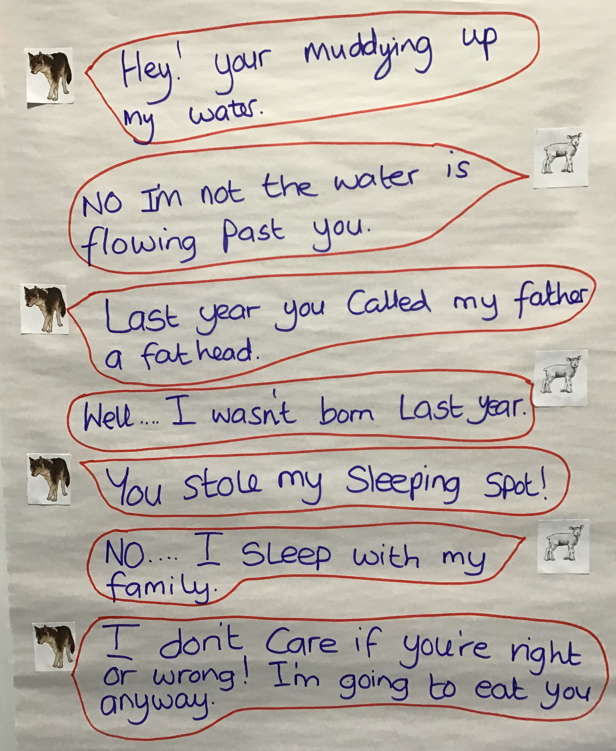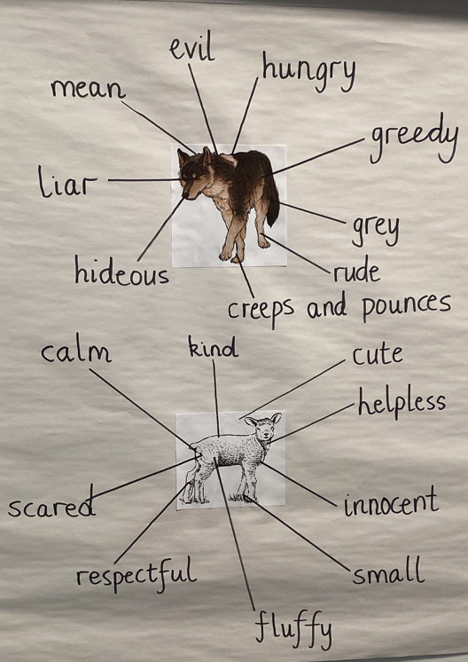 We have been listening to the fable 'Wolf and Lamb,' reading to write our own in our upcoming lessons. We explored different adjectives to describe the Wolf and Lamb, comparing their different character traits.