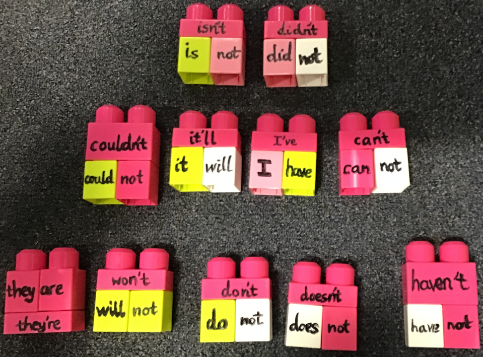 We looked at contractions in English, realising that it is when 2 words are joined together, using an apostrophe for the missing letters. Have a look at the work that some of us did below. We used blocks to find the 2 words and then placed the matching contraction on top, taking note of the apostrophe replacing the missing letter(s).