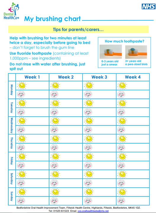 You have all received by now your toothbrush, toothpaste and toothbrushing chart. Please fill the chart in and return when completed. Please let us know if you need any further support.